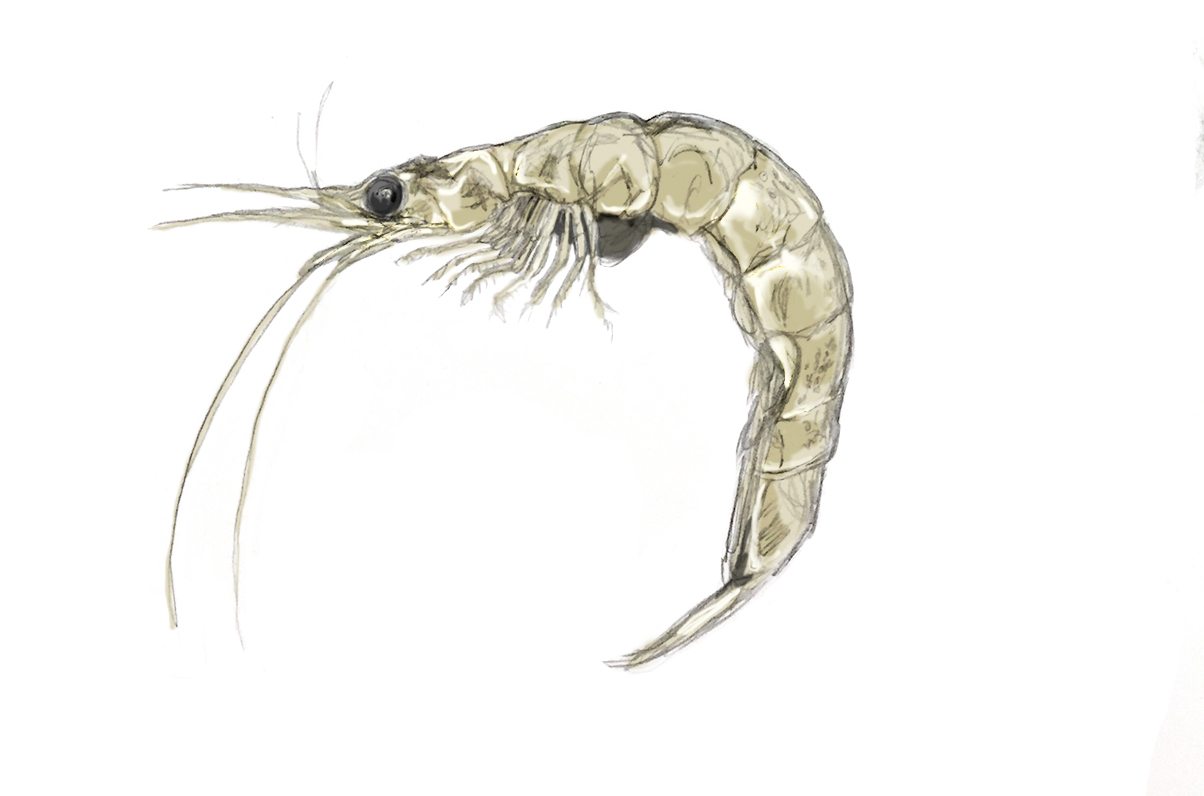 A drawing of a mysid, a small shrimp-like zooplankton.