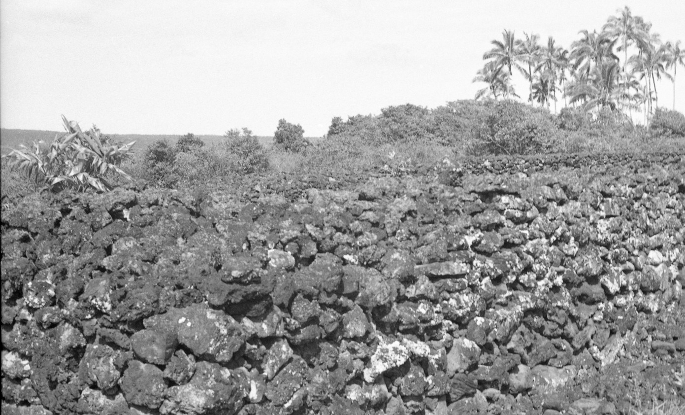 A black and white close-up image of a lava rock wall. The lava rock wall takes up three fourths of the image. The individual lava rocks of various shapes and sizes that are stacked to create the wall are easily visible. In the background there are various trees, a mountain, and another lava rock wall out of focus. This wall is in the top left side of the image.