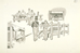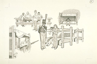 Series of vignettes depicts life in the Enlisted Men's Barracks including recreational time (games, letter writing, reading), and cleaning of weapons. Central vignette depicts a young recruit changing into his uniform while a Sergeant watches.
