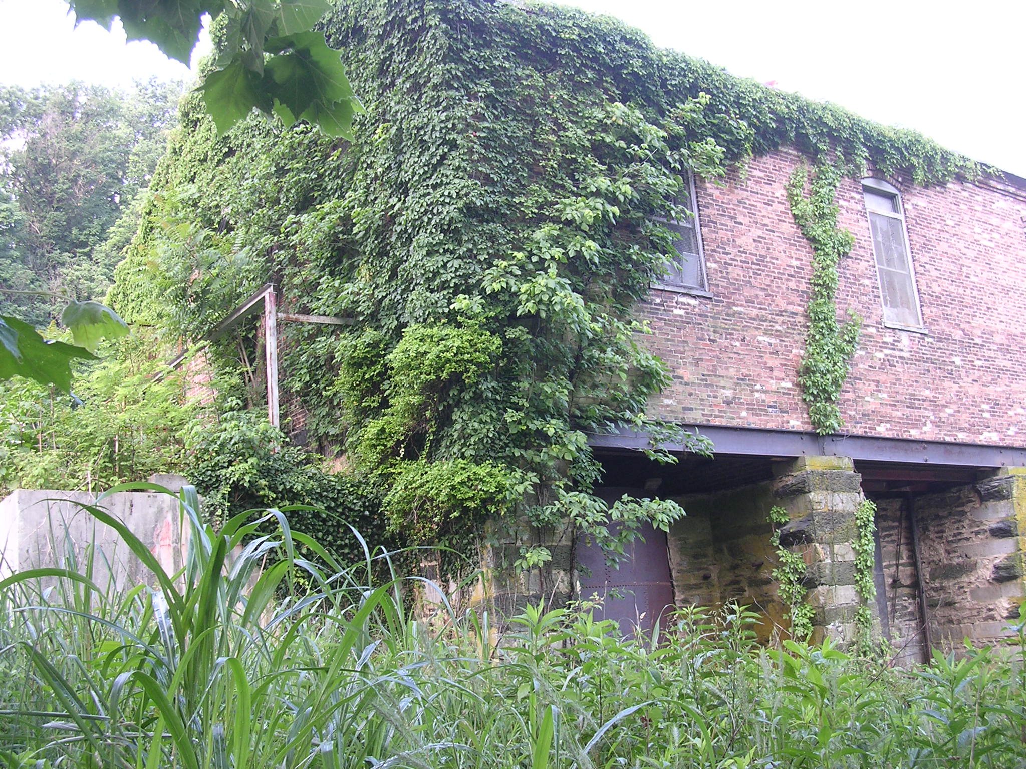 Views of the historic hydroelectric plant showing damages and extreme vegetation overgrowth as of 6/17/2011 in Lower Town of Harpers Ferry National Historical Park.