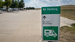 Green and white sign reads RV Parking No Cars Permitted in front or a large empty concrete parking lot and green trees.