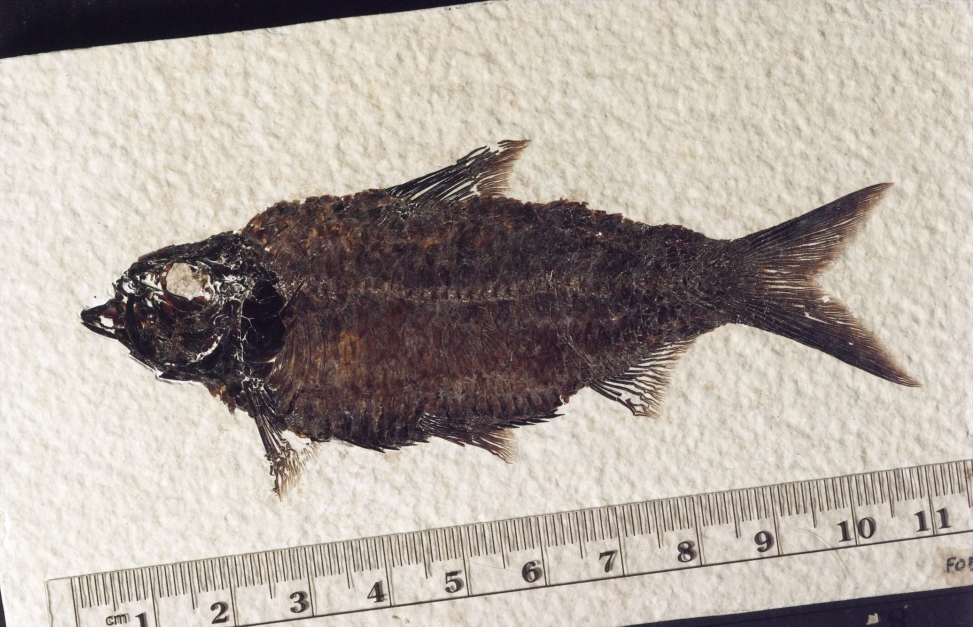 A dark brown fish fossil with almost black face faces left on a stippled tan stone. The fish is football-shaped. Below the fish is a centimeter ruler and the edge of the rock is visible on top left and bottom right.