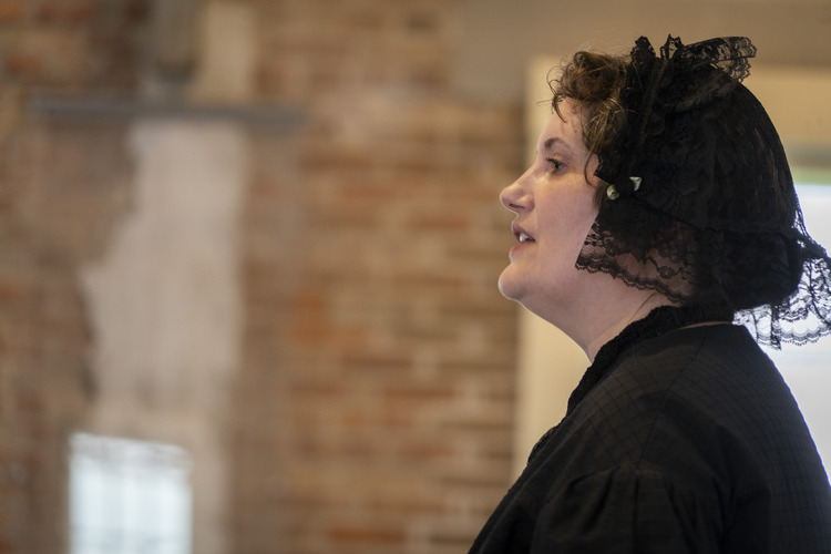 Elizabeth Cady Stanton (Melinda Grube) speaks in the Wesleyan Chapel.