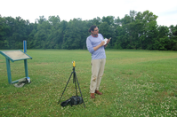 A man taking notes in a field.