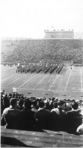 Marching band in formation in stadium at University of Michigan, Ann Arbor, where Maggie Laura Walker earned her M.D. degree.