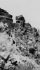 Black and white photograph showing a view from within a crater. The terrain is steep and jagged with many rocks. Vegetation can be seen along the rocks, but appear very dry. Towards the top half of the image, tall, vertical boulder formations extend upwards. Off-center, towards the right side, a person can be seen far in the distance on top of the boulders, close to the rim of the crater. The unidentified person poses for the camera with their arms in the air.