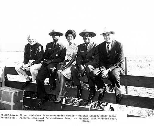 Spencers Mountain being filmed at Grand Teton National Park. (L to R): Delmar Daves, Director; Robert Stanton, Seasonal Ranger; Barbara McNair, Warner Brothers; William Kinard, Seasonal Ranger; Actor Henry Fonda, Warner Brothers.