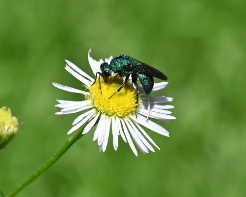 A cuckoo wasp (Hedychrum sp.) foraging on fleabane.