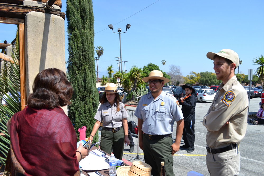 Three NPS employees stand behind a table with the Anza Trail logo that is stacked with brochures
