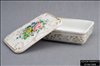 A German SPM porcelain box and cover, rectangular, with rounded corners and centrally painted with a bouquet of flowers within moulded gilt lines.