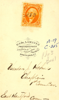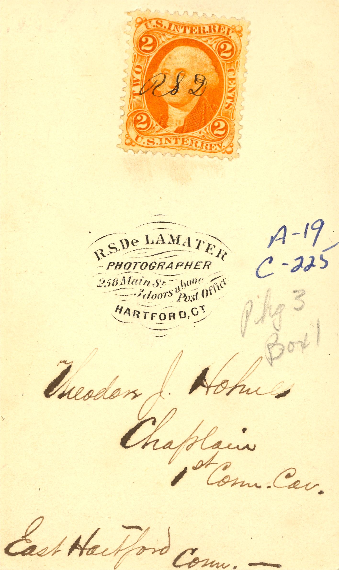 LIBI_00019_00225; This item is an albumen carte-de-visite (card-mounted photograph) of Theodore J. Holmes (Captain and Chaplain). The bust view photograph is 2 1/2 x 4" mounted and was produced circa 1865 by D.S. De Lamater of Hartford, Connecticut. Holmes was the chaplain of the 1st Connecticut Cavalry, Custer's first command. On the verso, handwritten notations in brown ink read, "Theodore J. Holmes/Chaplain/1st Conn. Cav./East Hartford/Conn." The photographer's stamp is printed in black. An orange 2 cent photographic cancellation stamp, featuring the image of George Washington, is also adhered to the verso.Note: "Pkg 3/Box 1" handwritten on the verso.; CARTE-DE-VISITE [Card photograph]; Courtesy of the National Park Service, Little Bighorn Battlefield National Monument, LIBI_00019_00225, D. S. De Lamater, "Captain and Chaplain Theodore J. Holmes," circa 1865