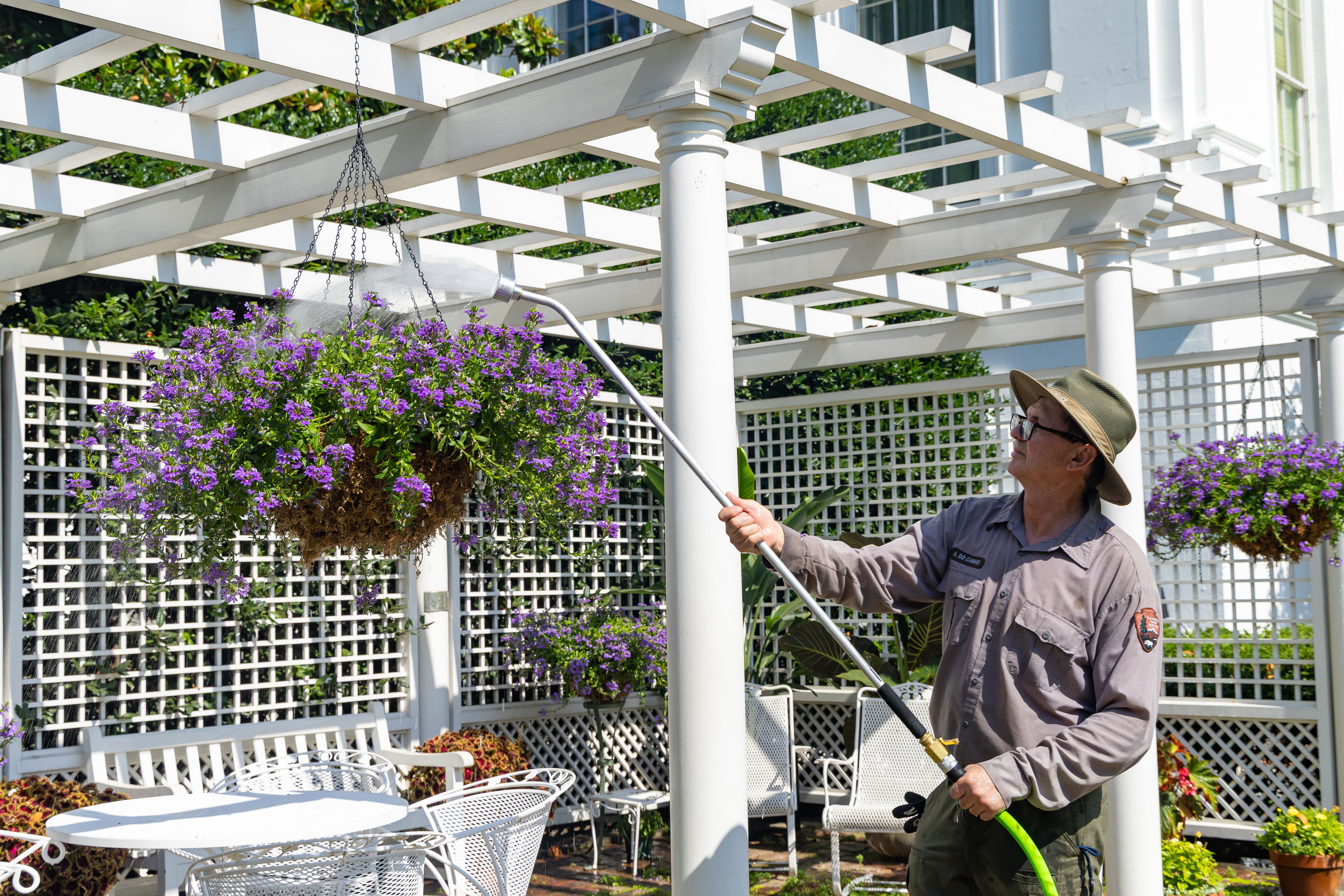 National Park Service Gardener Arino Do Carmo waters a hanging flower basket in the Jacqueline Kennedy Garden Pergola, June 25, 2025.