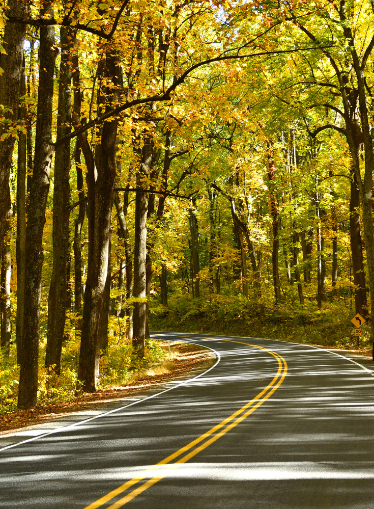 A tunnel of tall trees with bright yellow leaves on Skyline Drive.