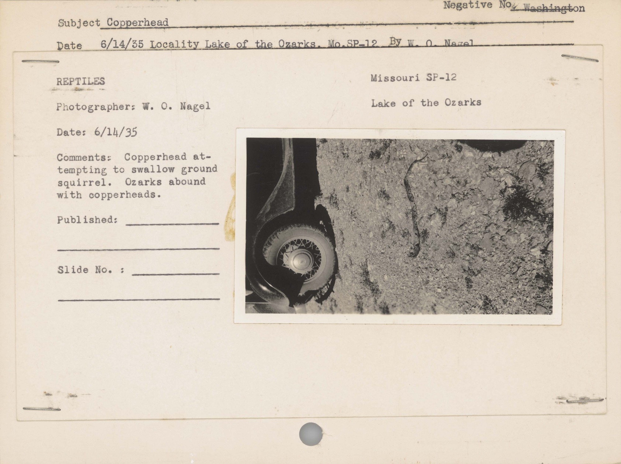 Copperhead. Locality: Lake of the Ozarks, Missouri, SP-12. No Negative on File . Comments: Copperhead attempting to swallow ground squirrel. Ozarks abound with copperheads.