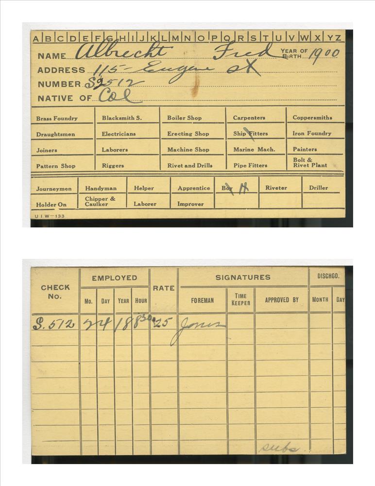 Early twentieth century employee card containing identifying information on the employee, and salary history, from Union Iron Works Co., which had been acquired by Bethlehem Steel Corporation.