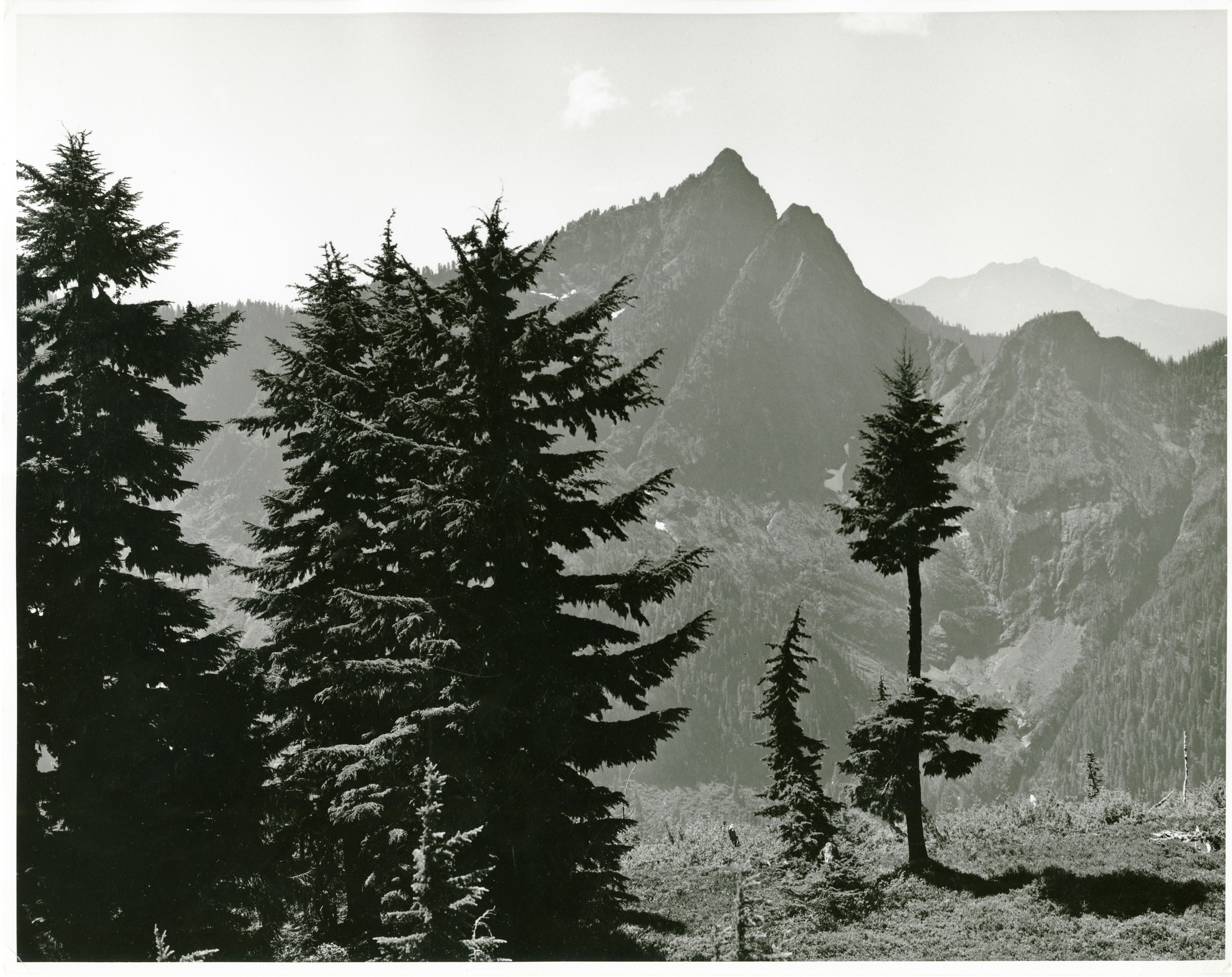 View across upper Stillaguamish Valley to Hall Peak with subalpine meadown & trees in foreground. (North Cascades NPS Complex Museum Collection, NOCA.0002 Assembled Collections, Series V: 1963 NPS North Cascades Survey Photographs, Subseries A: Prints and Negatives, File 046)