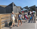Families walking down a marina boardwalk