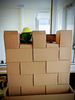 Plush green turtle with yellow helmet hiding in a castle made of cardboard blocks.