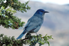 Blue colored bird perched on a juniper branch with clusters of blue juniper berries.