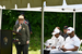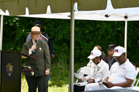 White woman wearing NPS dress uniform and flat hat stands at a podium with the NPS arrowhead speaking.