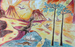 A color drawing of dinosaurs beneath volcanoes and nearby nests with dinosaur eggs in them. There are meteors falling from the sky and the volcanoes are erupting.