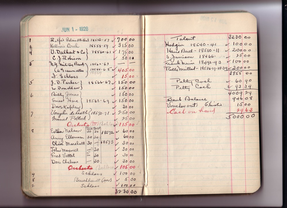 Thomas Edison's New York City Recording Studio Cash Book 20 (of 21), Image 54 (of 99). (Notebook #: PN-27-06-01, NPS catalog #: EDIS 1431), This book documents Diamond Disk matrices: 11720 – 19136, Needle Type matrices: N-100 – N-829, expenditures for recording artist fees and other payments authorized by studio manager Walter H. Miller from June 01, 1927 – March 30, 1929. Digitally scanned December 2004 through July 2005 at resolution 300 dpi, 24 bit.