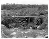 Black and white photo of a large gun in a dug out surrounded by rubble.