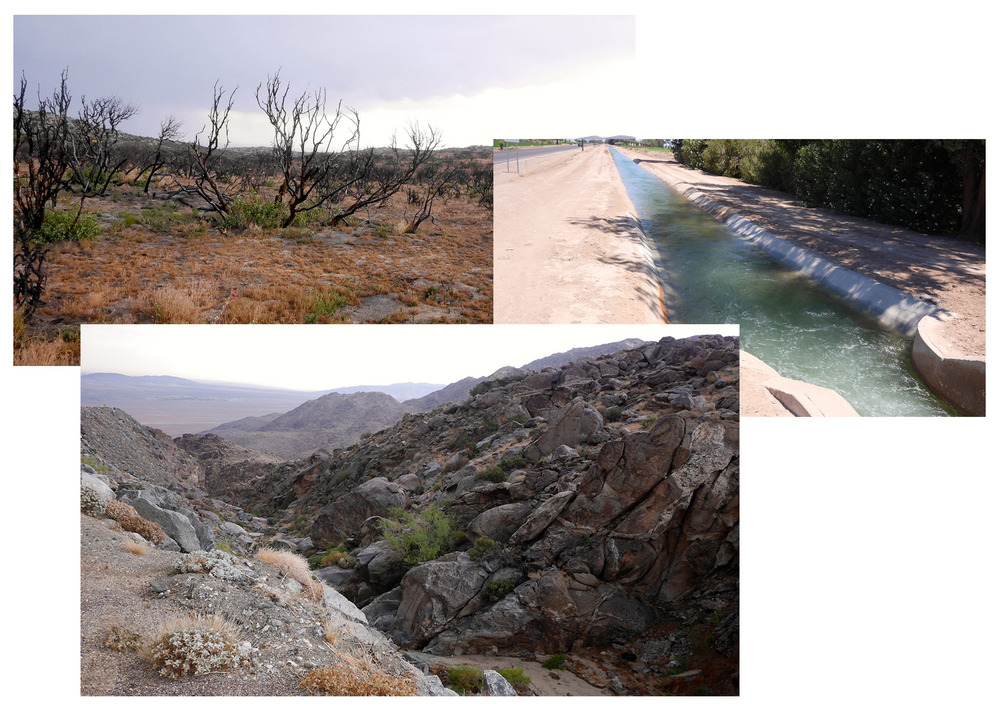 Three photos showing a charred desert landscape, a canal full of water, and a valley between two rocky low mountains