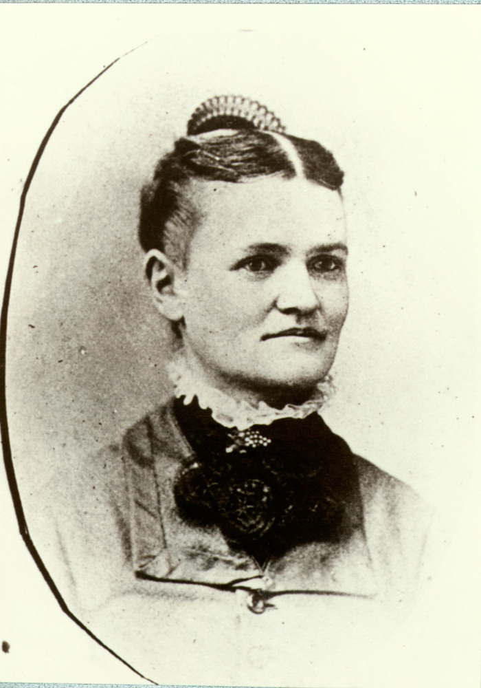 A 1879 portrait photo depicts a woman in a dress with parted hair and a comb.