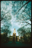 Independence Square. Looking up northeast past John Barry statue at Independence Hall exterior. Sky mostly in frame. Tower clock, nearly 2:25 PM.