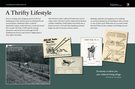Historic image of man and horse plowing a large garden. Other images from old catalogs show a variety of farm equipment. Text explains how the family lived off the land.