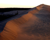 Wind from a predominately eastern direction plus ground rock from ancient glaciers creates sand dunes up to 150 hundred feet high in the park. Light shines on one side of sand dune with sharp ridge.