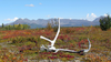 Autumn colors in Kobuk Valley from bearberry, dwarf birch and willow are striking against an old sun-bleached skull from a male caribou. White caribou skull on the ground surrounded by red and yellow vegetation. Photo taken near Onion Portage.