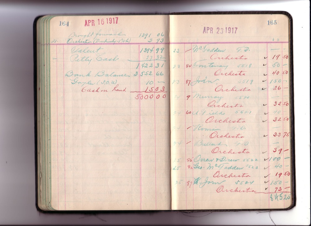 Thomas Edison's New York City Recording Studio Cash Book 14 (of 21), Image 60 (of 64). (Notebook #: PN-16-10-02, NPS catalog #: EDIS 1425), This book documents Diamond Disc matrices 5032 – 5528, expenditures for recording artist fees and other payments authorized by studio manager Walter H. Miller from October 02, 1916 – April 30, 1917. Digitally scanned December 2004 through July 2005 at resolution 300 dpi, 24 bit.