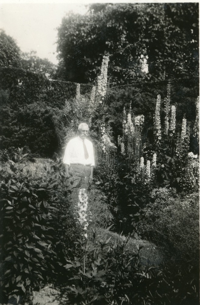 An old man standing among blooming flowers.