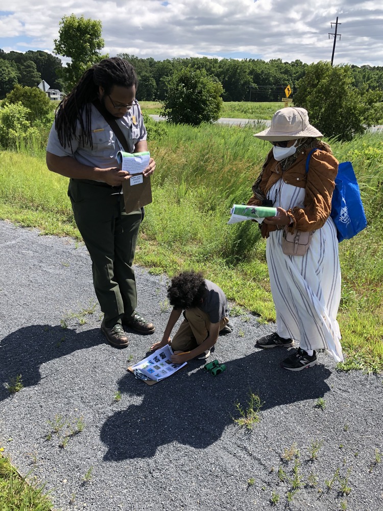 A park ranger assists two guests with a birding activity sheet.