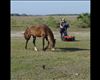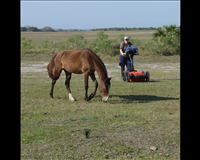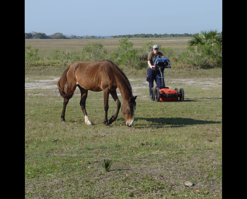 The island's feral horses will stand in the way of science if that's where the grass is best. Trees are a common obstacle to a ground penetrating radar survey, but in the Lower Garden at Dungeness, Jessica McNeil had to deal with one of the horses, which are not friendly and which damage the island's environment.