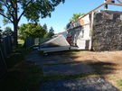 The photo is taken outside. The green construction fence is still up. There is a worker on the flat roof. The porch roof is intact but is on the ground. It is no longer attached to the house.