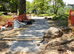 A partially completed concrete walkway winds between boulders, trees, construction materials, and orange construction fencing, with wood boards sitting at the end of the completed part of the walkway.
