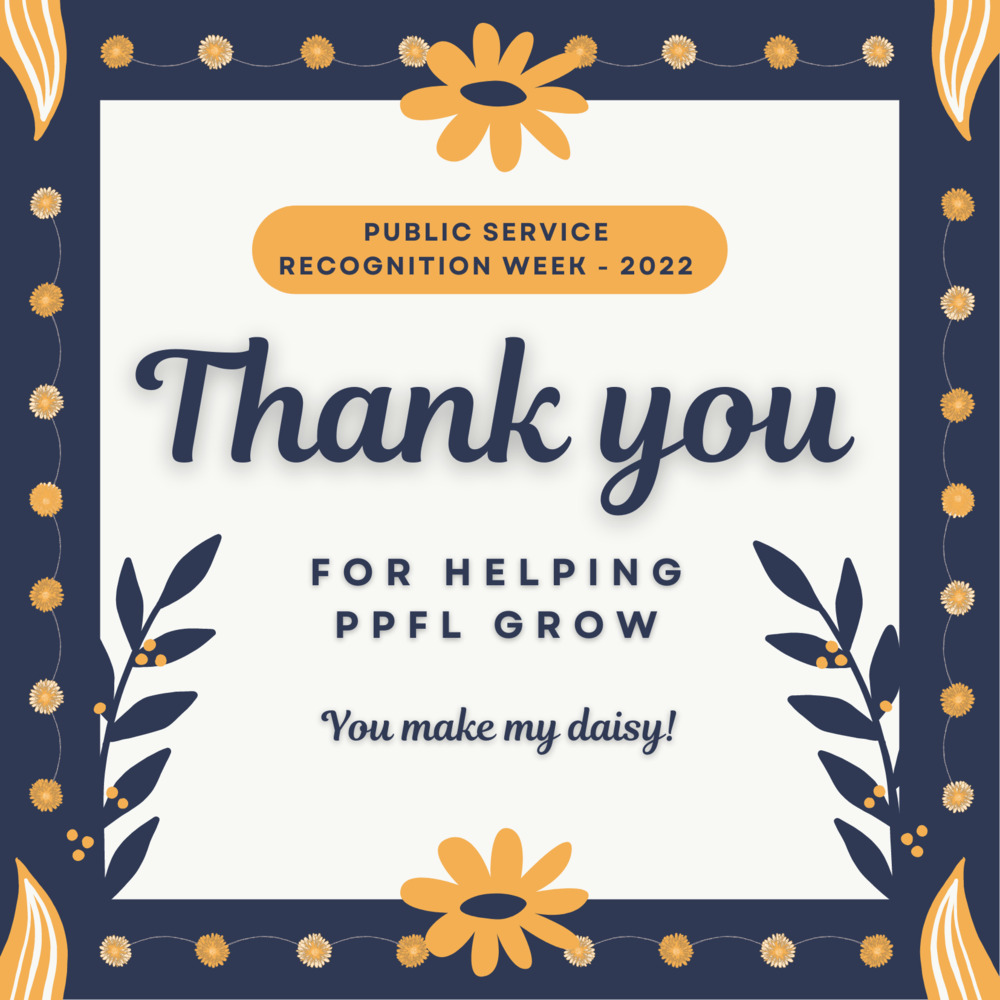 Blue border with yellow flowers and Public Service Recognition Week – 2022 in a yellow banner. Thank you for helping PPFL grow is written across the middle of the image with subtext of You make my daisy! in cursive below.