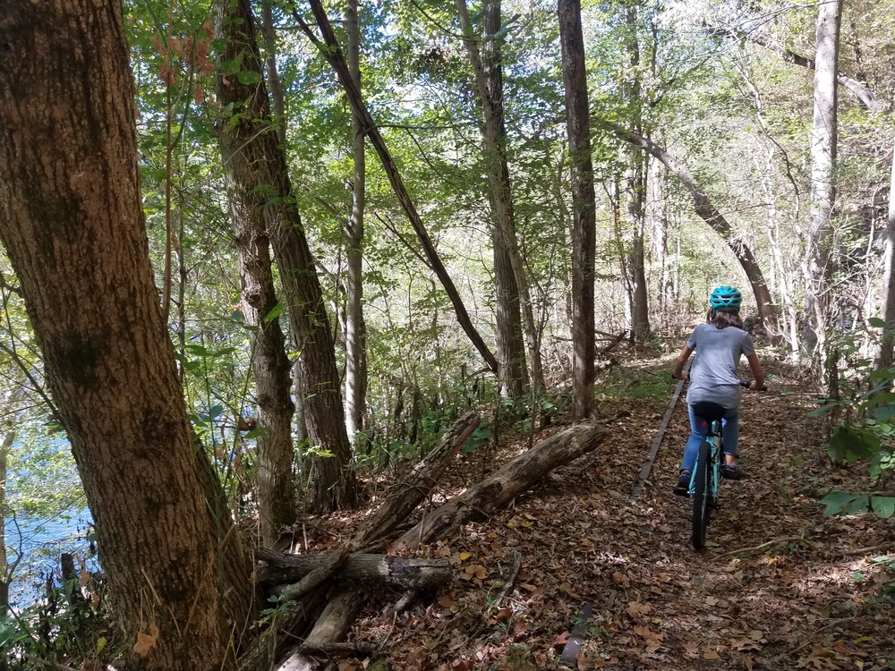 girl riding bike on a forest trail next to a river