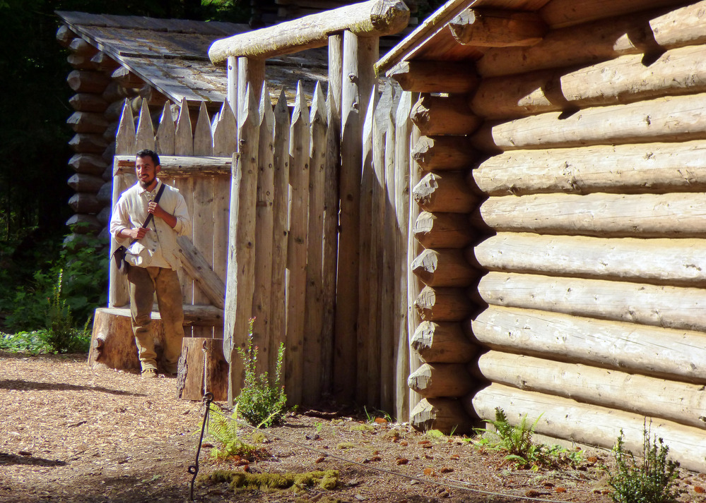 Ranger in 1800s attire stands in front of fort clatsop gates