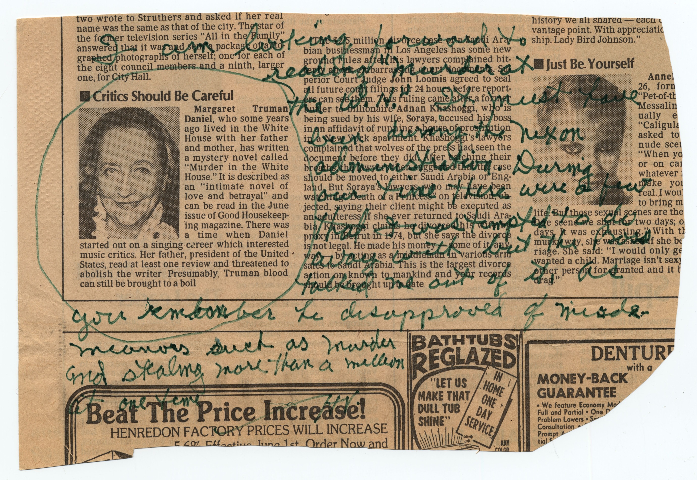 A newspaper clipping with notes in green pen written around a small photograph of Margaret Truman.