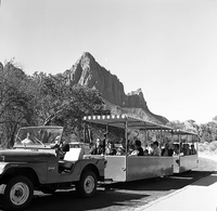 The tram ride from Zion Lodge concessions, summer 1977. Watchman Peak in background. ; ZION Museum and Archives Image ZION 14763 ; ZION 14763