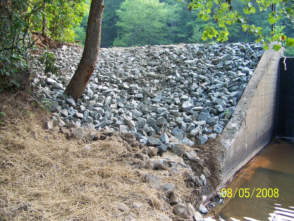 Camp 1 Dam with rip rap & seed/straw in place on right side looking North