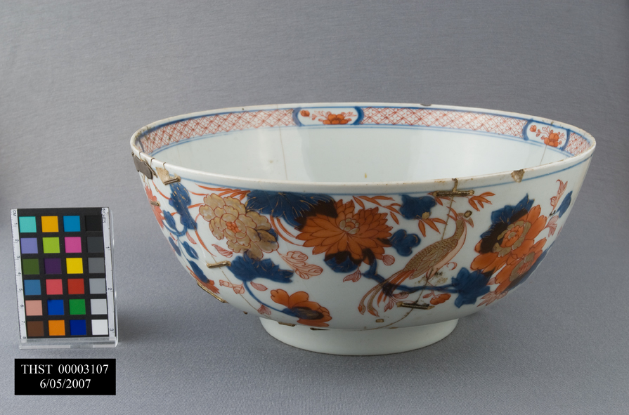 Bowl, baptismal, ceramic, mended with staples, said to have been used as christening bowl (one listed in Thomas Stone's Annapolis inventory)