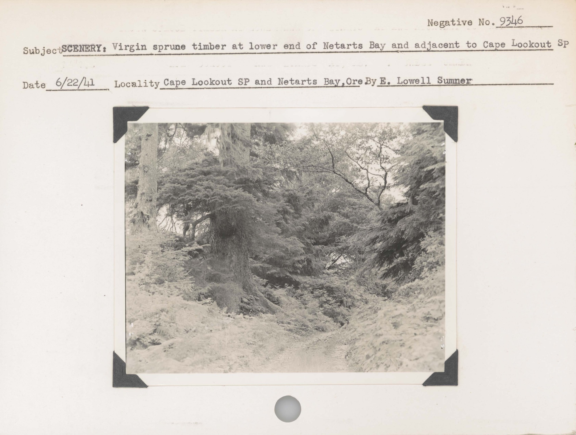 Scenery – Virgin spruce timber at lower end of Netarts Bay and adjacent to Cape Lookout State Park. Negative#: 9346. Location: Cape Lookout State Park and Netarts Bay, Oregon.