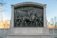 A stone memorial with bronze statue of soldiers marking and a commander on a horse.