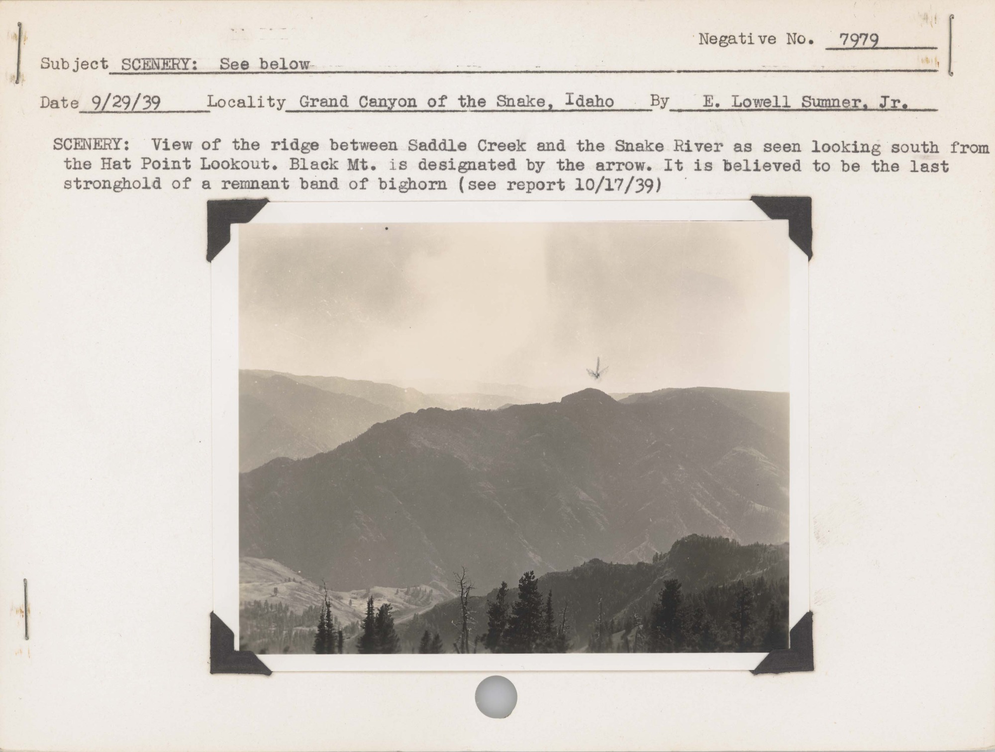 Scenery: View of the ridge between Saddle Creek and the Snake River as seen looking south from the Hat Point Lookout. Black Mountain is designated by the arrow. It is believed to be the last stronghold of a remnant band of bighorn sheep (see report 10/17/39). Saddle Creek Canyon is in the foreground, while the main Snake River Canyon lies behind the ridge [This information is written on the reverse of the card]. Negative #: 7979. Locality: Grand Canyon of the Snake, Idaho [Hells Canyon National Recreation Area].