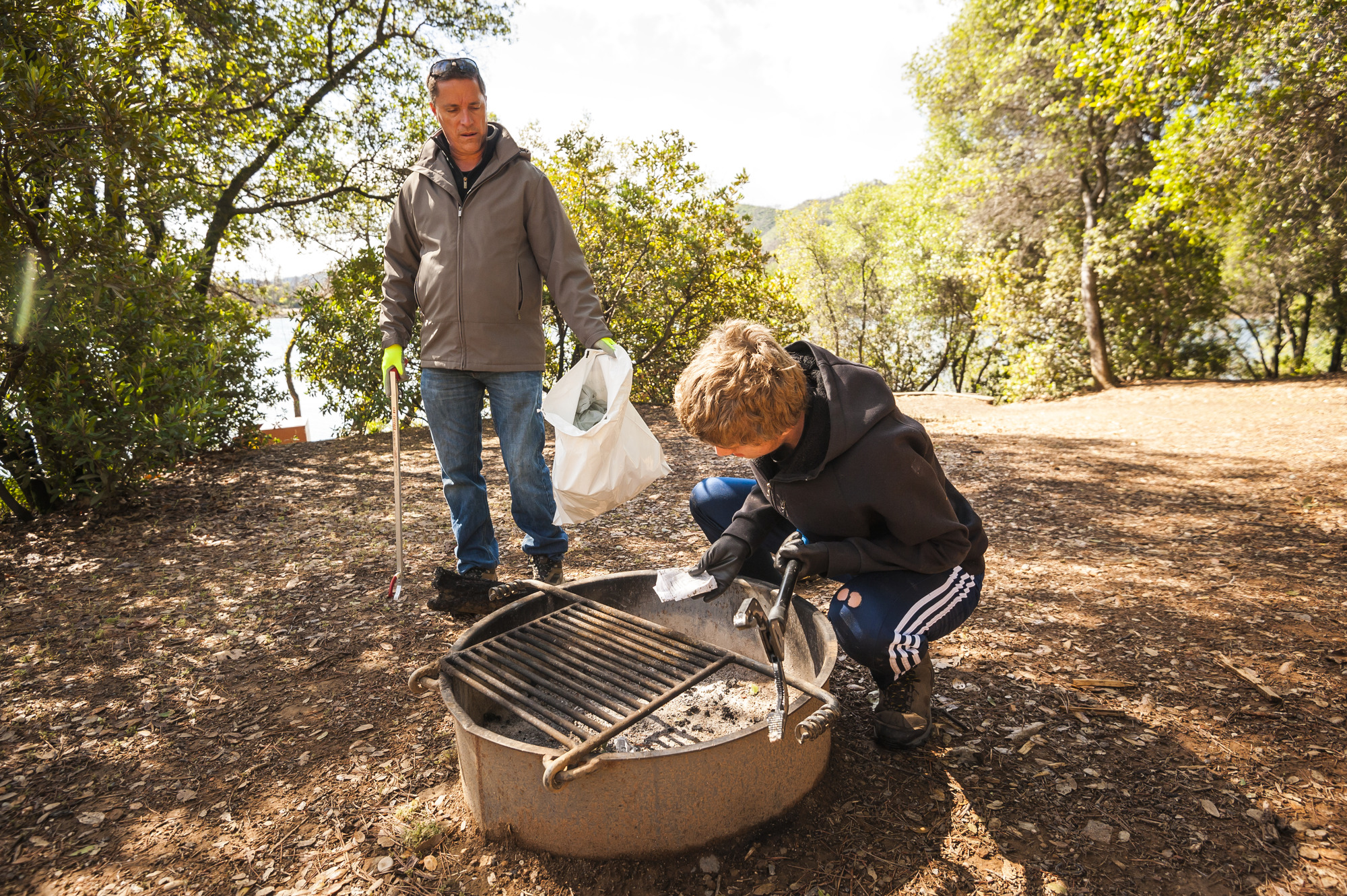 Two volunteers working to clean out trash and ash from a fire pit.